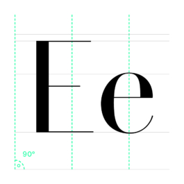 Vitrine also features a Didones characteristic vertical angle of stress meaning the contrast axis relates in a 90° angle to the baseline. Generally speaking we can say that vertical strokes are thick and horizontal strokes are thin. The difference between these stroke thicknesses is called the contrast, which is extremely high in Vitrine and can be a distinct feature of display typefaces.